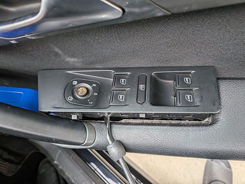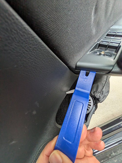 スイッチパネルとドアのアームレスト(柔らかい部分)の間に、青い工具の先端を差し込みます。パネルの**前側(車両の前方方向)**か、横の隙間から入れるのがスムーズ。