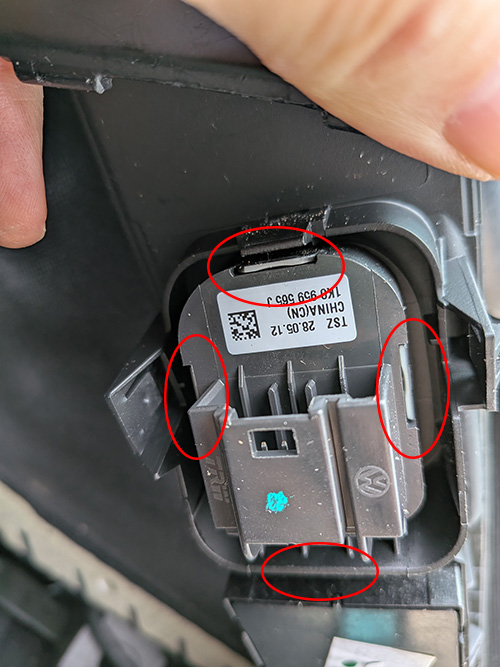 パネルの裏側から古いスイッチの残骸を固定している爪を広げ、取り外します。そこに新しいスイッチをカチッとはめ込みます。 私の場合は、左の画像のスイッチユニットを外したら、蓋だけ残ってしまった。。。なので同様に蓋の爪を広げて外した。